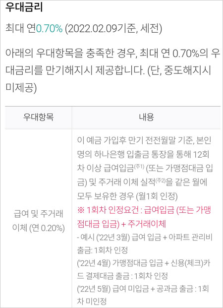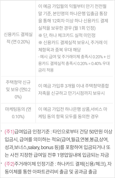 - 급여 및 주거래 이체(연0.20%), 신용카드 결제실적(연0.20%), 주택청약 신규 및 보유(연0.20%), 마케팅동의(연0.10%)