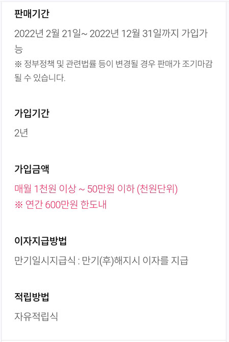 - 2022년 2월 21일~2022년 12월 31일까지 가입가능. 다만 정부정책 및 관련법률 등이 변경될 경우 판매가 조기 마감 될 수 있습니다.