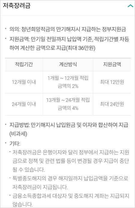 청년희망적금 저축장려금은 1년차 납입액의 2%, 2년차 납입액의 4% 만큼 지원된다고 합니다. 매월 50만원씩 2년간 납입하면 최대 36만원을 받는 방식이라고 합니다. 또한 이자소득에 대한 이자소득세(세율 14%), 농어촌특별세(세율 1.4%)는 과세되지 않는다고 합니다.