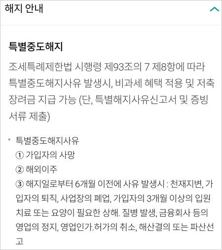 - 특별중도해지 사유 발생시 비과세 혜택 적용 및 저축장려금 지급 가능(단, 특별해지사유신고서 및 증빙서류 제출)