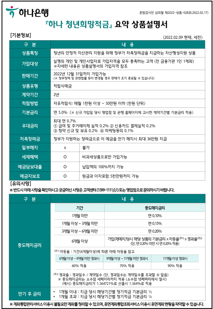 하나은행 청년희망적금 요약 상품설명서 출처: 하나은행