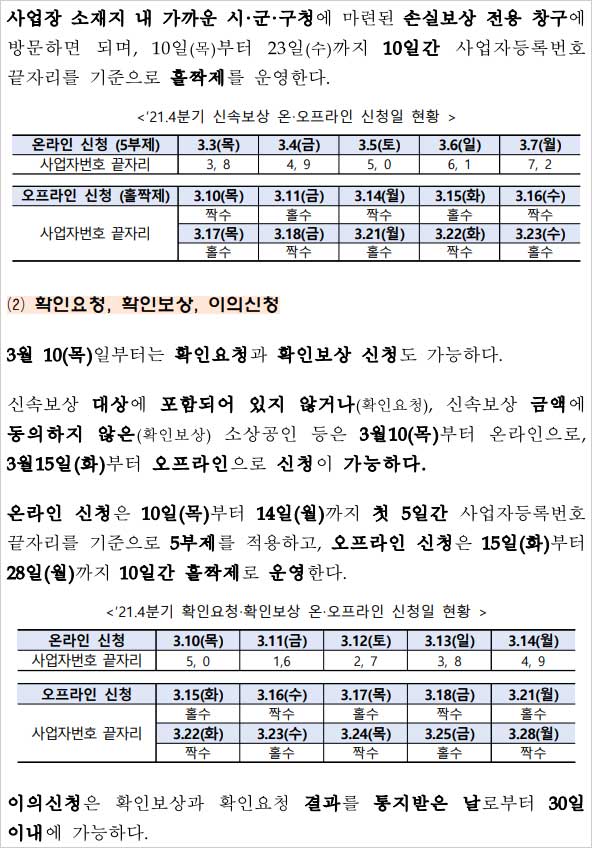 3월 10일부터는 확인요청과 확인보상 신청도 가능하다고 합니다. 신속보상 대상에 포함되어 있지 않거나(확인요청), 신속보상 금액에 동의하지 않은(확인보상) 소상공인 등은 3월10일 부터 온라인으로, 3월15일 부터 오프라인으로 신청이 가능하다고 합니다.