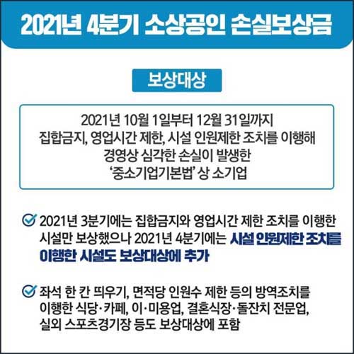 2021년 3분기에는 집합금지와 영업시간 제한 조치를 이행한 시설만 보상했다고 합니다. 하지만 2021년 4분기에는 시설 인원제한 조치를 이행한 시설도 소상공인 손실보상금 대상 확인 및 보상대상에 추가했다고 합니다.