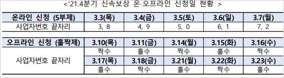 온라인 신청은 10일(목)부터 14일(월)까지 첫 5일간 사업자등록번호 끝자리를 기준으로 5부제를 적용하고, 오프라인 신청은 15일(화)부터 28일(월)까지 10일간 홀짝제로 운영된다고 합니다.