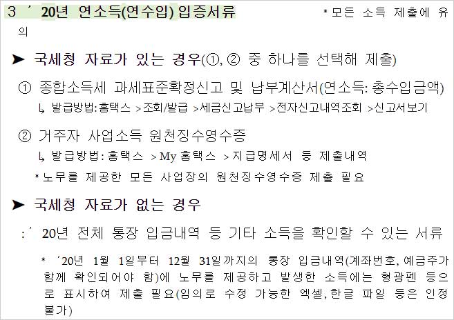 ② 국세청 자료가 없는 경우: 2020년 전체 통장 입금내역 등 입증 가능 서류.