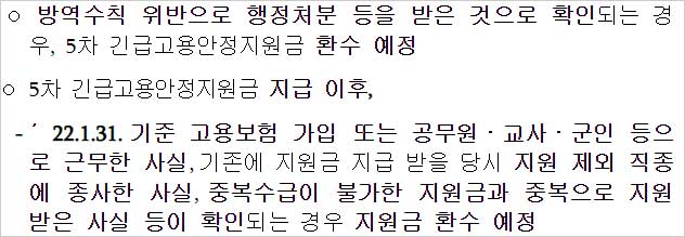 ▶ 방역수칙 위반으로 행정처분 등을 받은 것으로 확인되는 경우, 5차 긴급 고용안정지원금 환수 예정이라고 합니다.