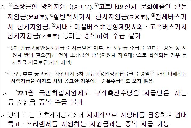 ▶ ① 소상공인 방역지원금(중기부), ② 코로나19 한시 문화예술인 활동지원금(문화부), ③ 일반택시기사 한시지원금(고용부), ④ 전세버스기사 한시지원금, ⑤ 시내·마을버스非공영제및시외 및 고속버스기사한시지원금(국토부) 등과는 중복하여 수급이 불가능합니다.