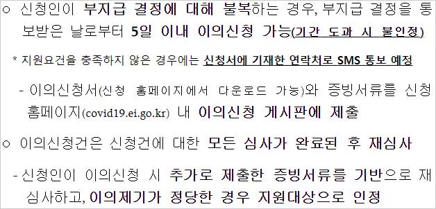 - 이의신청서(신청 홈페이지에서 다운로드 가능)와 증빙서류를 신청 홈페이지(covid19.ei.go.kr) 내 이의신청 게시판에 제출 해야 합니다.