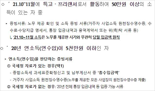▶ 2021년 10월~11월에 특고 및 프리랜서로서 활동하여 50만원 이상의 소득이 있는 자 중