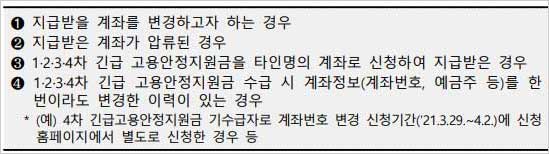 * (예) 4차 긴급고용안정지원금 기수급자로 계좌번호 변경 신청기간(’21.3.29~4.2)에 신청 홈페이지에서 별도로 신청한 경우 등이 해당된다고 합니다.