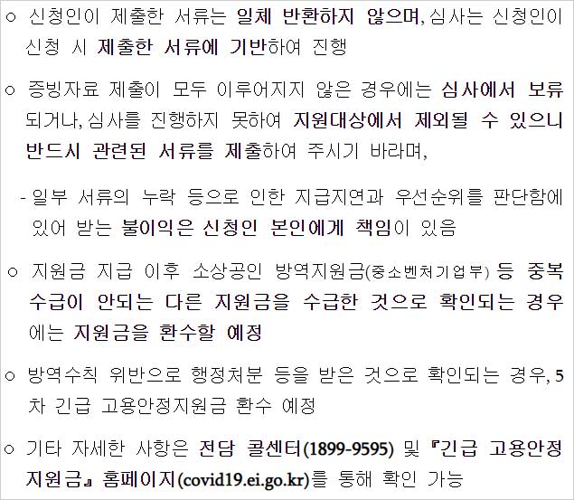 * 5차 긴급고용안정지원금을 지급받은 이후, 타 지원금 수급을 원하는 경우 동 지원금 반납이 필요합니다.(지급 전에 소상공인 방역지원금 지원대상으로 확인되는 경우 동 지원금 지급보류 처리 예정)