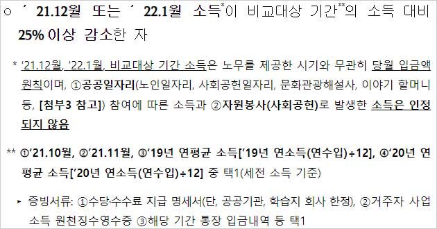 * ‘21.12월, ’22.1월, 비교대상 기간 소득은 노무를 제공한 시기와 무관히 당월 입금액 원칙이며, ①공공일자리(노인일자리, 사회공헌일자리, 문화관광해설사, 이야기 할머니 등, 참여에 따른 소득과 ②자원봉사(사회공헌)로 발생한 소득은 인정되지 않음.