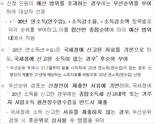 ▶ 우선순위 검토는 신청인이 제출한 서류에 기반하며, 국세청에 2020년 소득을 신고한 경우에는 종합소득세 신고내역 또는 거주자 사업소득 원천징수영수증을 반드시 제출해야 합니다.
