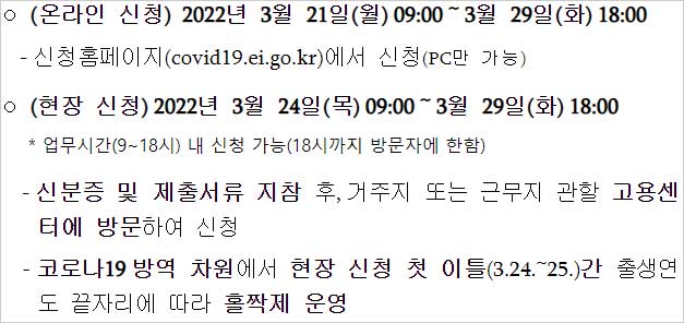 - 신청 홈페이지(covid19.ei.go.kr)에서 신청(PC만 가능합니다)