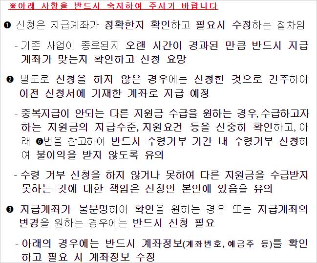 - 수령 거부 신청을 하지 않거나 못하여 다른 지원금을 수급받지 못하는 것에 대한 책임은 신청인 본인에 있음을 유의해야 합니다.