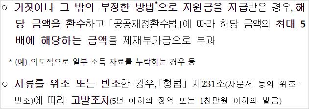 ▶ 거짓이나 그 밖의 부정한 방법*으로 지원금을 지급받은 경우, 해당 금액을 환수하고 공공재정환수법에 따라 해당 금액의 최대 5배에 해당하는 금액을 제재부가금으로 부과합니다.