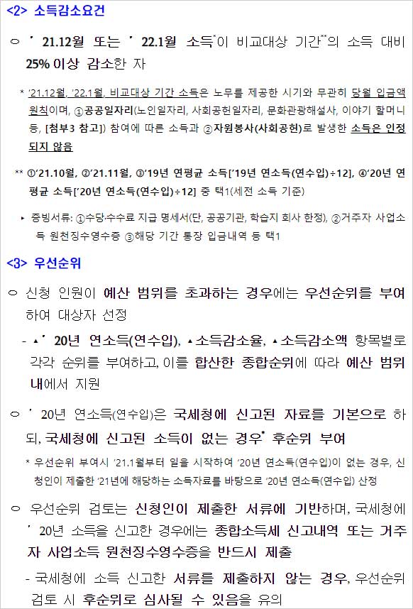 ▶ 우선순위 검토는 신청인이 제출한 서류에 기반하며, 국세청에 2020년 소득을 신고한 경우에는 종합소득세 신고내역 또는 거주자 사업소득 원천징수영수증을 반드시 제출해야 합니다.