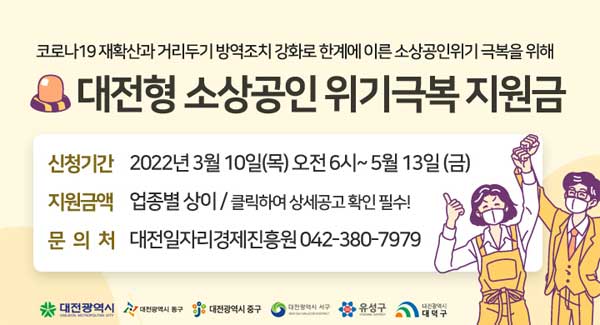 오늘은 대전 소상공인 위기극복지원금인 대전 소상공인 재난지원금 신청 대상 및 대전 소상공인 재난지원금 신청방법, 대전 소상공인 재난지원금 신청 서류, 신청기간 등에 대해 간단하게 알아보도록 하겠습니다. 대전광역시와 5개 자치구는 코로나19 재확산과 방역수칙 장기화로 어려움을 겪고 있는 소상공인을 위해 3월 10일 오전 6시부터 위기극복지원금 대전 소상공인 재난지원금 신청을 받는다고 합니다.