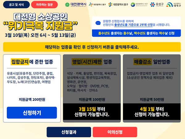 위기극복지원금 대전 소상공인 재난지원금 신청 접수는 집합금지에 준한 업종과 영업시간제한업종, 매출감소 일반업종을 구분하여 별도의 신청기간을 두고 순차적으로 진행된다고 합니다. 대전시는 당초 3월 15일부터 신청을 받을 계획이었지만 생존권을 위협받고 있는 소상공인의 피해보전과 경영안전을 지원하기 위해 3월 10일로 접수 시점을 앞당겼다고 합니다.