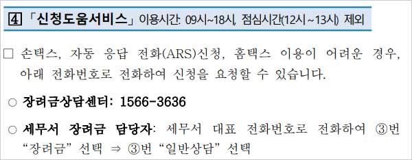 - 세무서 장려금 담당자: 세무서 대표 전화번호로 전화하여 ③번 "장려금" 선택 ⇒ ③번 "일반상담" 선택하면 됩니다.