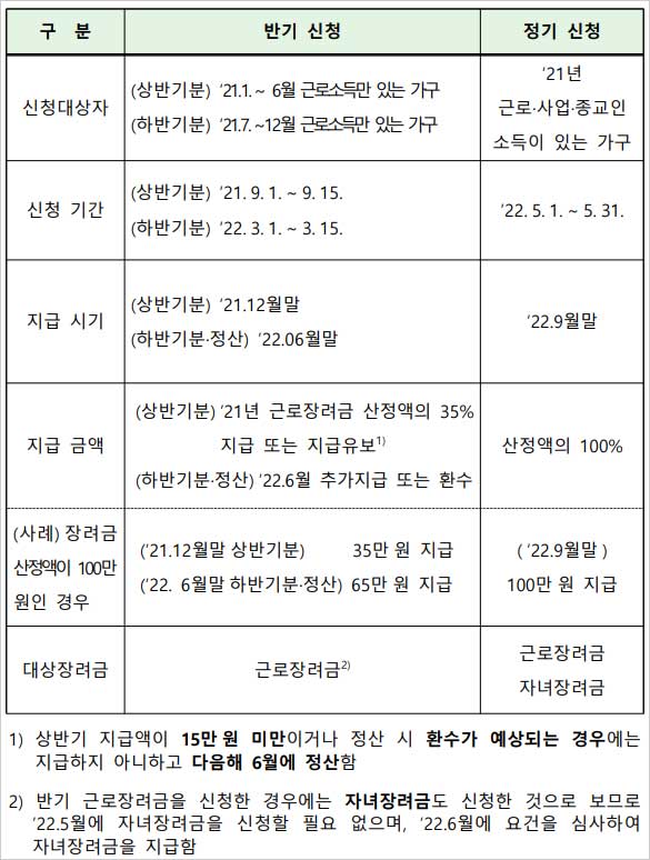 2. 다만, 작년 9월에 2021년 상반기분 근로장려금을 신청한 가구는 2021년 하반기분 근로장려금도 신청한 것으로 보기 때문에 이번에 신청할 필요가 없다고 합니다.