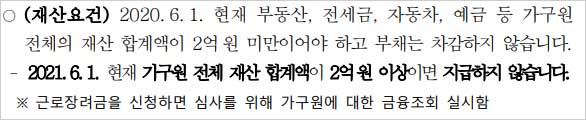 ▶ 2020. 6. 1. 현재 부동산, 전세금, 자동차, 예금 등 가구원전체의 재산 합계액이 2억원 미만이어야 하고 부채는 차감하지 않는다고 합니다. 따라서 2021.6.1. 현재 가구원 전체 재산 합계액이 2억원 이상이면 근로장려금이 지급되지 않는다고 합니다. 참고로 근로장려금을 신청하면 심사를 위해 가구원에 대한 금융조회가 실시된다고 합니다.