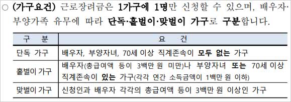 1. 가구요건에 따른 소득, 재산요건을 모두 충족한 근로소득만 있는 가구가 신청대상이 된다고 합니다.