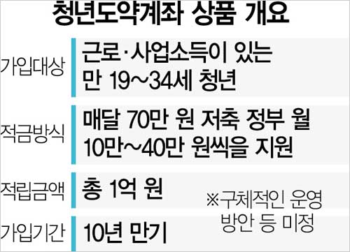근로 및 사업소득이 있는 만 19~34세 청년이 매달 70만원 한도 안에서 일정 금액을 저축하면 정부가 매달 10만~40만원을 더해 10년 만기(연 3.5% 복리 적용)로 1억원을 만들어주는 상품이라고 합니다. 청년도약계좌는 소득이 적을수록 정부 지원금이 더 많이 적용되는 구조라고 합니다.