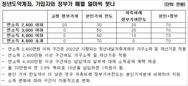 근로 및 사업소득이 있는 만 19~34세 청년이 매달 70만원 한도 안에서 일정 금액을 저축하면 정부가 매달 10만~40만원을 더해 10년 만기(연 3.5% 복리 적용)로 1억원을 만들어주는 상품이라고 합니다. 윤석열표 청년적금 청년도약계좌는 소득이 적을수록 정부 지원금이 더 많이 적용되는 구조라고 합니다.