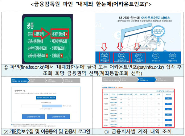 간단한 가입 인증 절차를 거친 후 홈페이지에서 숨어있는 예금 및 보험금 조회 등을 클릭하면 내가 보유하고 있는 계좌와 보험, 카드는 물론 자동이체 및 대출 목록까지 한눈에 볼 수도 있다고 합니다.
