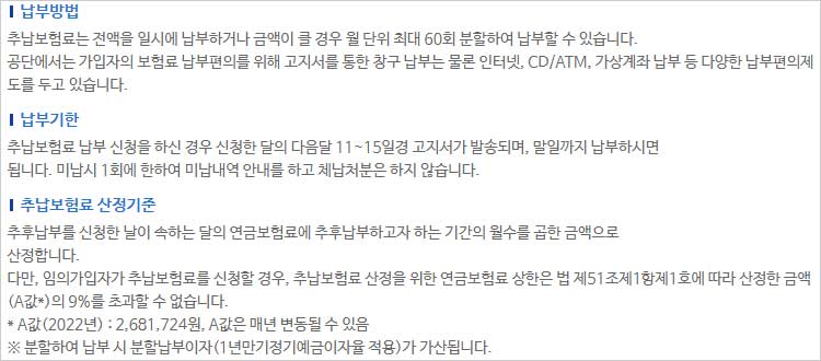2022년 A값은 2,681,724으로 임의가입자 월 국민연금 추납보험료 금액은 2022년 A값인 2,681,724원x 9% = 24만1355원을 초과해 납부할 수 없다고 합니다. 참고로 A값은 매년 변동될 수 있으며 단, 추납보험료를 분할해 납부할 경우 분할납부이자(1년만기 정기예금 이자율 적용)가 가산 된다고 합니다.