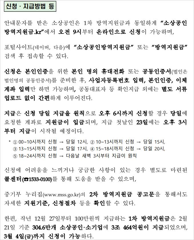 2차 300만원 소상공인 방역지원금 대상자 확인 지급은 신청 당일 지급이 원칙이라고 합니다. 오후 6시까지 신청할 경우 당일에 요청한 계좌로 지원금이 입금된다고 합니다. 지급 첫날인 23일에는 오후 3시부터 지급이 시작될 예정이라고 합니다.