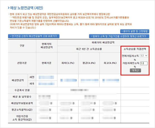 예상수령액은 현재 기준과 최근 5년간 소득상승률에 따라 달라집니다. 최저는 3.2%, 평균은 4.1%, 최고는 4.9%입니다. 특히 오른쪽 상단에서 본인이 직접 선택해서 비교할 수 있습니다.