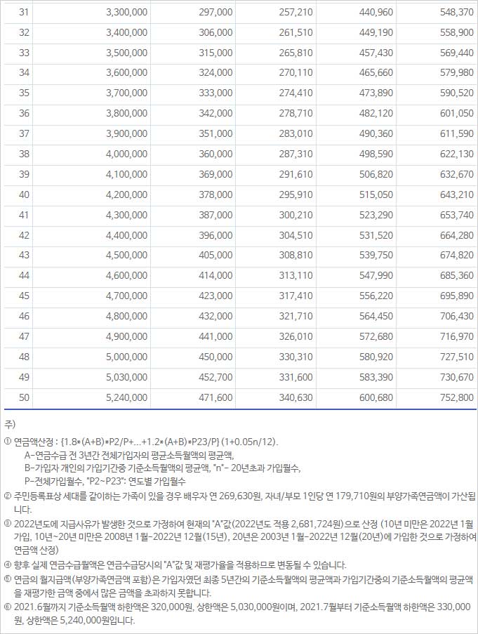 ▶ 연금의 월지급액(부양가족연금액 포함)은 가입자였던 최종 5년간의 기준소득월액의 평균액과 가입기간중의 기준소득월액의 평균액을 재평가한 금액 중에서 많은 금액을 초과하지 못합니다.