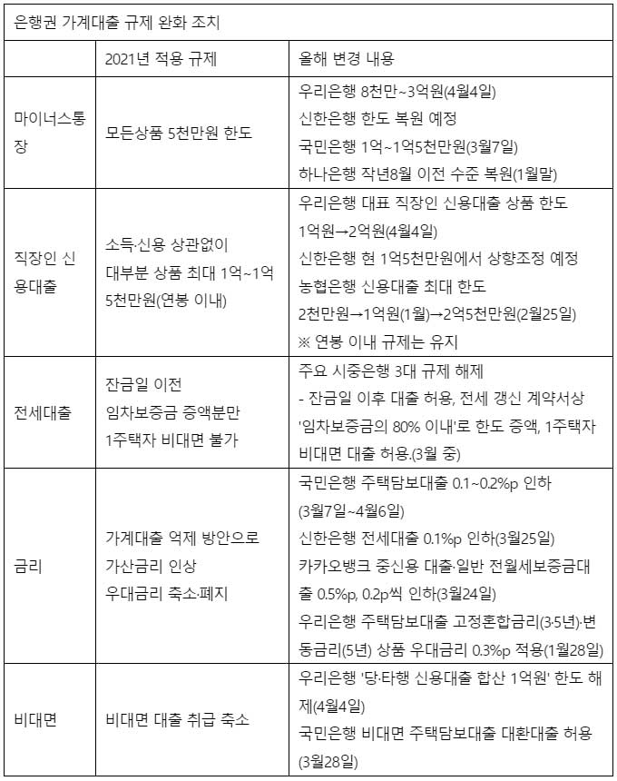 지난해 금융 당국의 가계부채 관리 강화를 계기로 시행된 시중은행의 각종 대출 규제들이 본격적으로 풀리기 시작했다고 합니다. 마이너스통장 한도를 5000만원으로, 신용대출 한도는 연소득 이내로 제한하는 등 대부분의 규제는 가계부채 관리 강화 방안 시행 이전으로 돌아갔다고 합니다.
