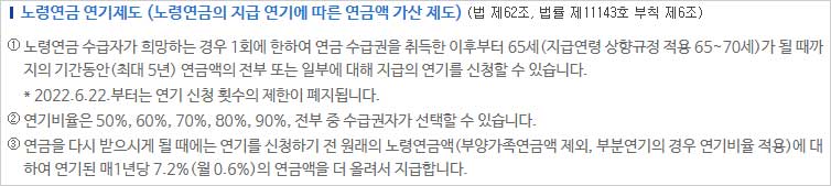 하지만 이처럼 손해를 보면서도 국민연금 조기노령연금을 수급하는 것은 실직과 명예퇴직 등으로 일자리를 잃은 은퇴자들이 국민연금을 받지 않으면 생활이 곤란해지기 때문인 것으로 나타났다고 합니다. 반면 이와는 다르게 국민연금을 늦춰서 지급받게 될 경우 1년씩 연기할 때마다 연 7.2% 더 많은 금액을 수령할 수 있다고 합니다.