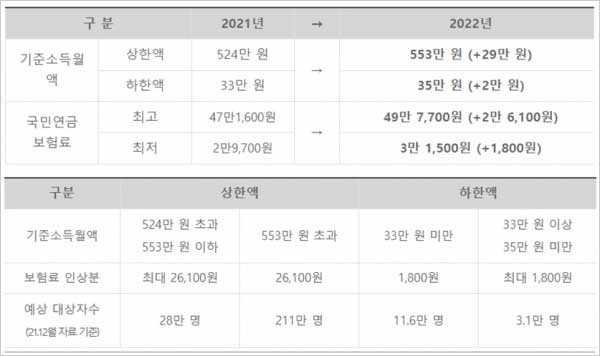 기준소득월액 상한액은 524만 원에서 553만 원으로 29만 원, 하한액은 33만 원에서 35만 원으로 2만 원 인상됐다고 합니다. 이에 따라, 일부 가입자는 월 보험료가 높아지지만, 연금급여액 산정에 기초가 되는 가입자 개인의 생애 평균 소득월액이 높아져 연금 수급연령에 도달하면 더 많은 연금을 받게 된다고 합니다.