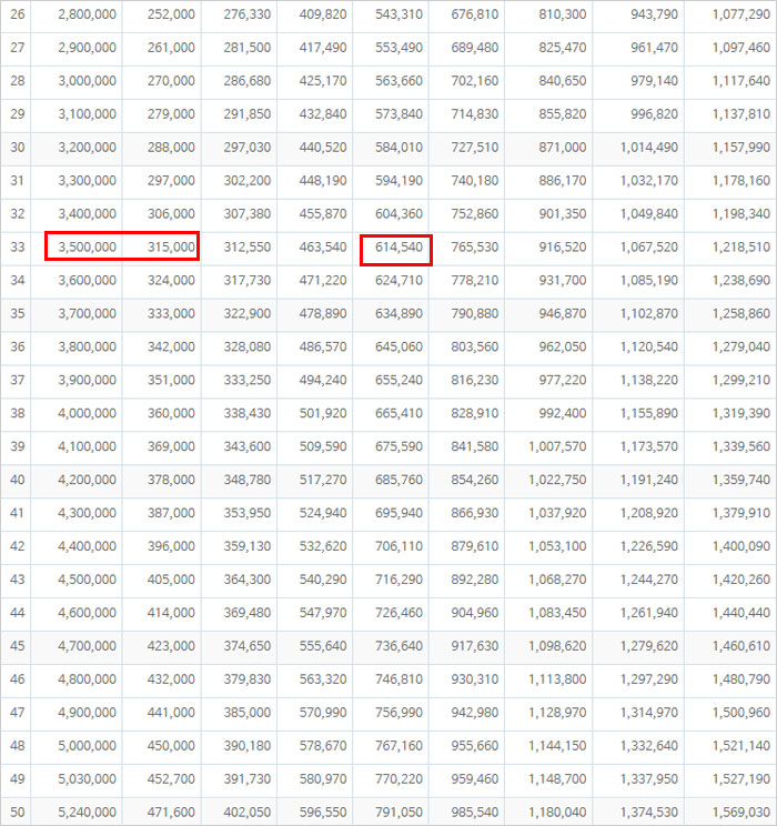 예상연금월액표에서는 현재 내고 있는 보험료를 토대로 미래 지급받을 수 있는 연금액을 확인할 수 있는데요. 만약 350만원의 소득에 315,000의 보험료를 20년 동안 낸다고 가정 했을 때 예상연금월액표에서는 매월 614,540원의 연금을 지급 받는 것으로 나오네요. 하지만 이 또한 예상연금액이기 때문에 참고만 해야한답니다.