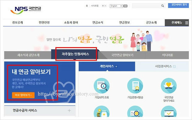 62년생 국민연금 납입기간 수령액 조회 방법 중 첫번째 방법은 공인인증서 없이 알아보기 방법인데요. 먼저 다음이나 네이버, 구글 등의 검색창에 국민연금을 검색해 주세요. 이 후 국민연금관리공단 홈페이지에서 자주찾는 민원서비스를 클릭하시구요. 다음 왼쪽 하단에 있는 내연금 알아보기를 클릭해 주세요.