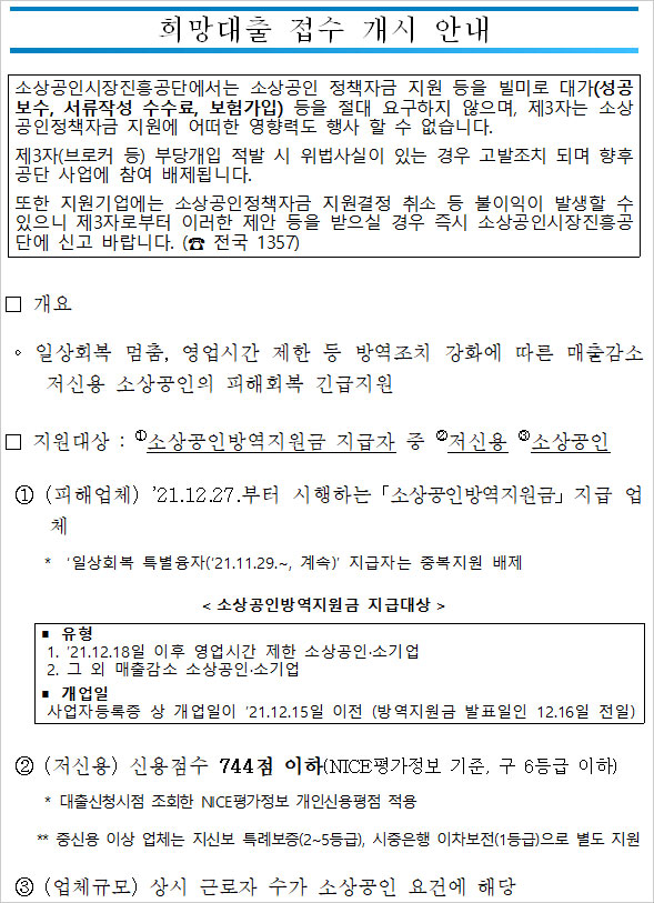 다음은 소상공인시장진흥공단에서 발표한 저신용 소상공인 정책자금 대출 희망대출 신청 방법 및 대상자격, 융자조건, 접수기간, 대출 신청 서류, 대출제한대상 등에 대한 공고문입니다.