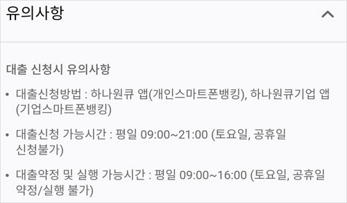 - 대출신청방법: 하나원큐 앱(개인스마트폰뱅킹), 하나원큐기업 앱(기업스마트폰뱅킹)
