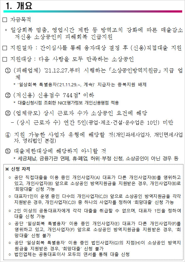 중기부에 따르면 지난해 12월15일 이전 개업한 소상공인과 소기업 중 △21년 12월18일 이후 영업시간 제한 △버팀목플러스 및 희망회복자금 지급 △2019년 또는 2020년 동기대비 2021년 11월 또는 12월 매출 감소 등의 조건에 해당돼야 한다고 합니다.
