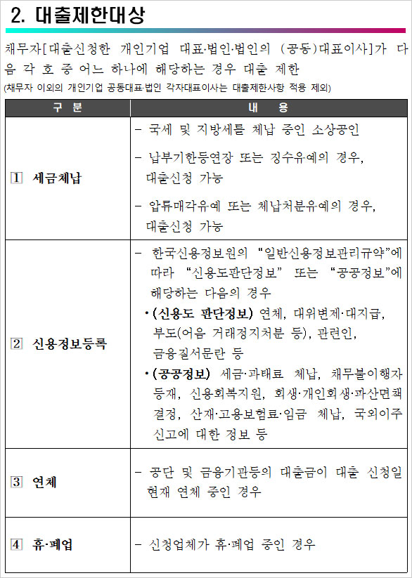 세금체납 및 신용정보등록, 연체, 휴업 및 폐업, 허위 또는 부정신청 목적 외 자급사용, 중복지원 제한 등의 내용이라고 합니다.
