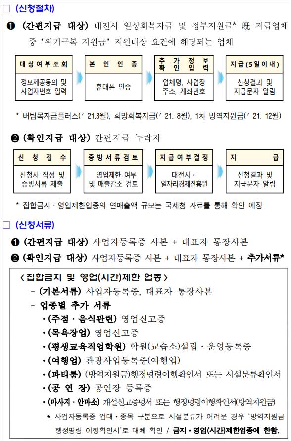 위기극복 긴급지원금 대전 소상공인 재난지원금 신청은 간편지급대상과 확인지급대상으로 구분하여 신청하게 된다고 합니다. 간편지급 대상에는 대전시 일상회복자금과 그동안 정부에서 지급한 버팀목자금플러스, 희망회복자금, 1차 방역지원금 지급대상에 포함되었던 업체가 해당된다고 합니다.