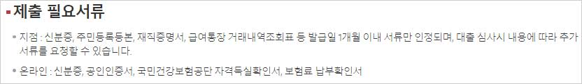 ▶ 지점 : 신분증, 주민등록등본, 재직증명서, 급여통장 거래내역조회표 등 발급일 1개월 이내 서류만 인정되며, 대출 심사시 내용에 따라 추가 서류를 요청할 수 있습니다.
