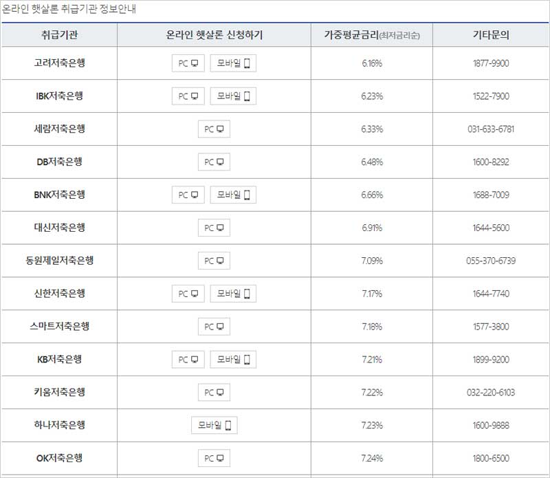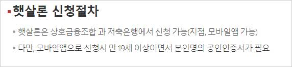 ▶ 햇살론은 상호금융조합 과 저축은행에서 신청 가능(지점, 모바일앱 가능)