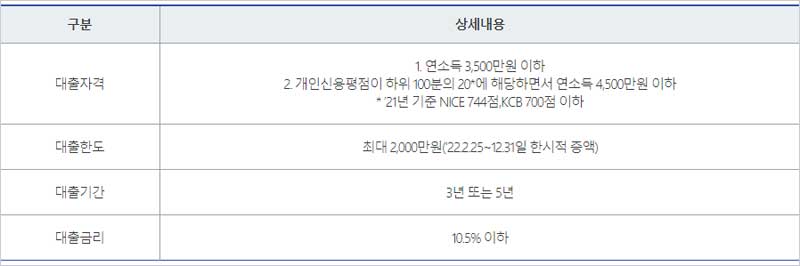 ▶ 저신용자 : 개인신용평점이 하위 100분의 20*에 해당하면서 연소득 4,500만원 이하