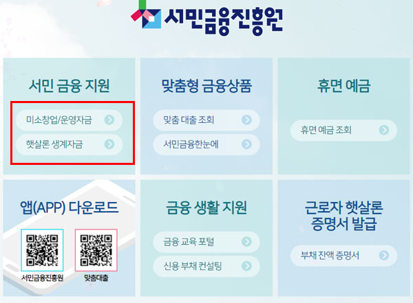 다만 햇살론 대출자격 자금지원종류 중 생계자금과 긴급생계자금을 클릭하게 되면 근로자 햇살대출이 가능한 서민금융진흥원 사이트가 연결된다고 합니다. 서민금융진흥원 서비스 사이트 자금지원 항목에서 생계자금 및 긴급생계자금을 확인하고 신청할 수 있다고 합니다.