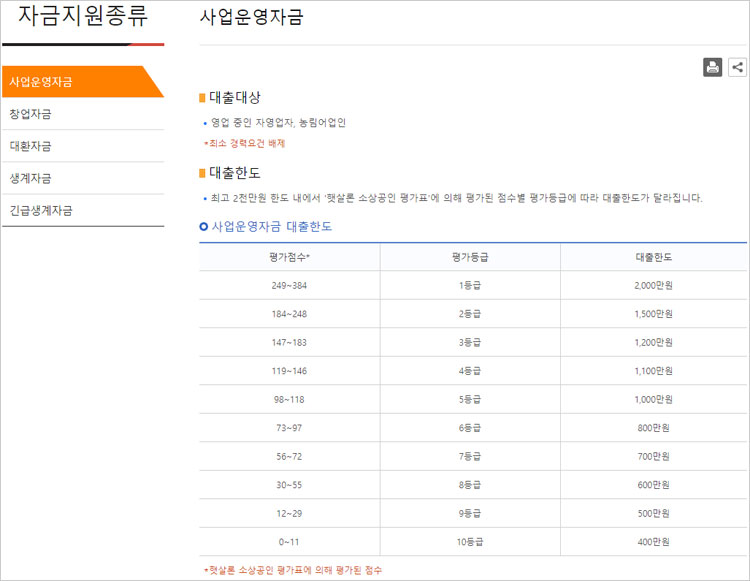 ⊙ 최고 2천만원 한도 내에서 '햇살론 소상공인 평가표'에 의해 평가된 점수별 평가등급에 따라 대출한도가 달라집니다.