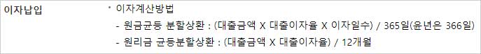 - 원금균등 분할상환 : (대출금액 X 대출이자율 X 이자일수) / 365일(윤년은 366일)